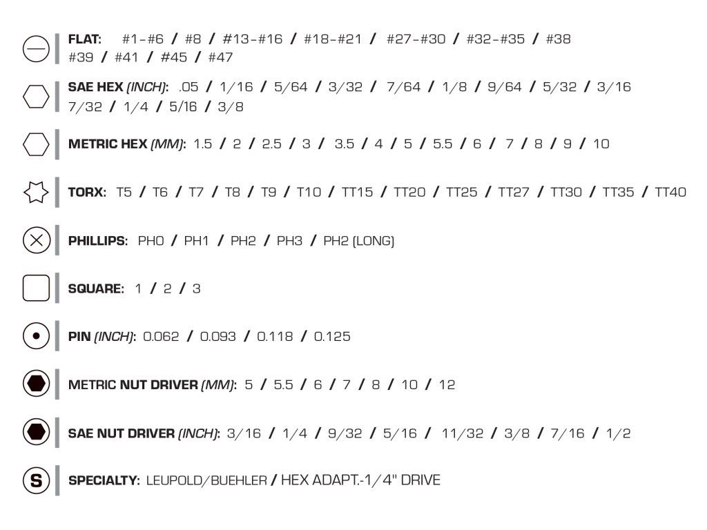 - Komplexná výbava: Obsahuje ploché, krížové (Phillips), štvorcové, imbusové (SAE/Metric), Torx a špeciálne bity pre takmer všetky bežné skrutky na zbraniach.