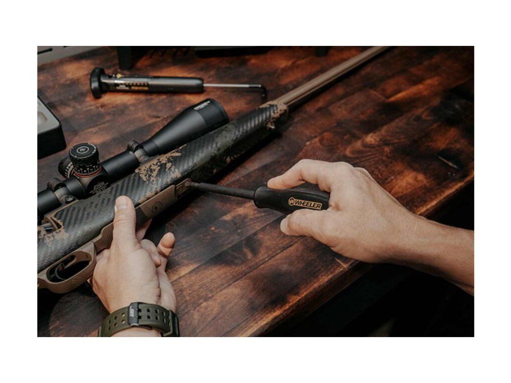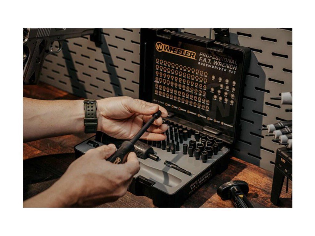 Posuňte svoju puškársku prácu na úplne novú úroveň. Táto 100-dielna profesionálna sada od Wheeler® je splneným snom každého puškára a náročného strelca. Spája v sebe legendárny momentový kľúč F.A.T. Wrench (Firearm Accurizing Torque) a 97 precíznych bitov a adaptérov, s ktorými zvládnete akúkoľvek úlohu.