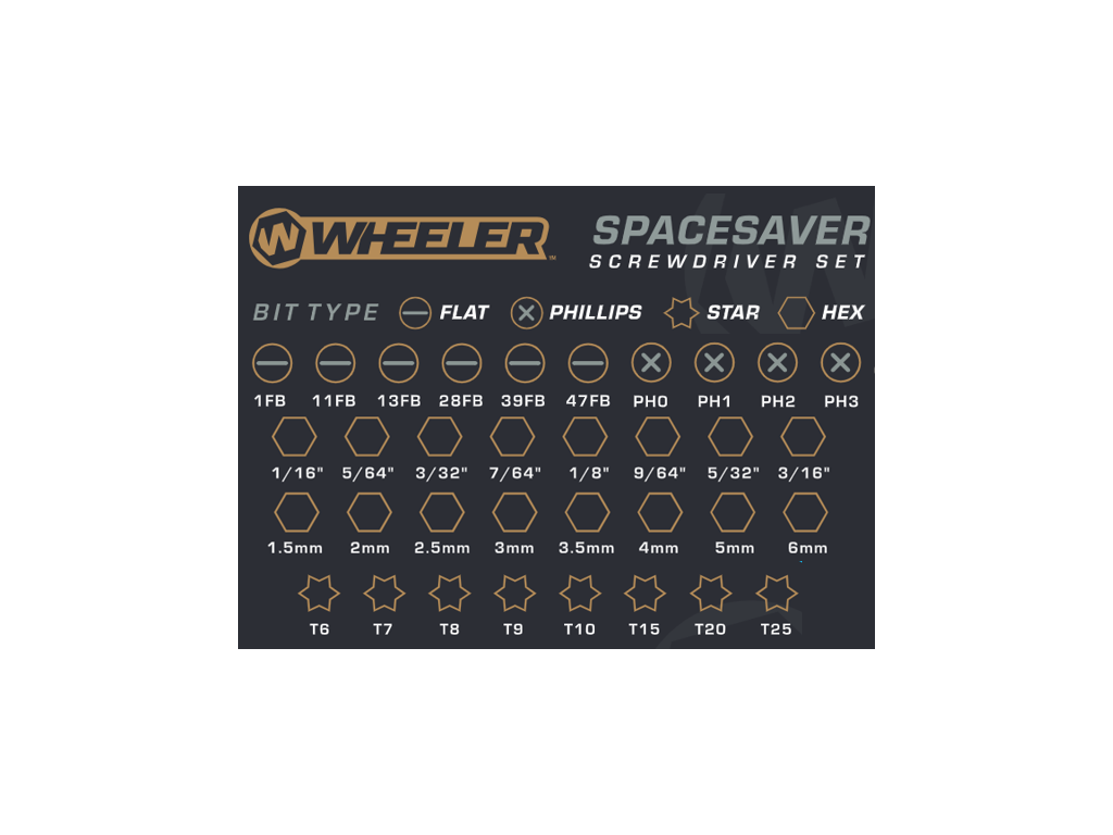 Malá rozmermi, veľká výkonom. Wheeler® Spacesaver je dokonalým riešením pre každého, kto hľadá maximálnu efektivitu v kompaktnom balení. Táto 36-dielna sada obsahuje starostlivo vybraný sortiment bitov (imbusové SAE aj metrické, Torx, krížové a ploché), ktoré sú ideálne pre bežné opravy v domácnosti, ale najmä pre potreby strelcov a kutilov.