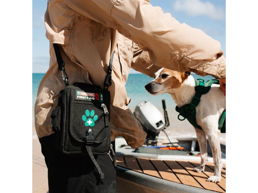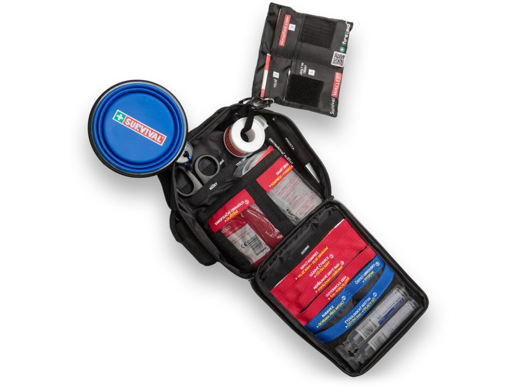 SURVIVAL PET KIT je lekárnička navrhnutá špeciálne pre pohyb so psom - od bežnej prechádzky po viacdenné dobrodružstvo. Je postavená na jedinečnom systéme farebne rozdelených sekcií, ktorý vám okamžite ukáže, kde presne nájdete vybavenie pre konkrétny typ problému. Vďaka popísaným vreckám je všetko hneď viditeľné, prehľadné a ľahko dostupné aj pod tlakom.