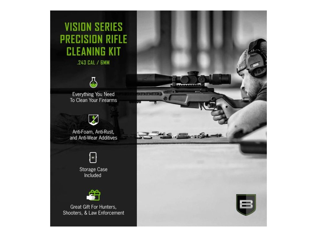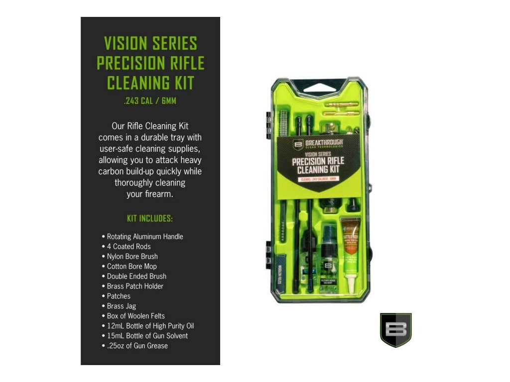 Naša kompaktná čistiaca súprava na pušky Breakthrough Clean Technologies® Vision Series™ kalibru .243 / 6 mm vám ponúka všetko, čo potrebujete na dôkladné čistenie. Jej plastový zásobník uchováva všetky rôzne časti súpravy úhľadne usporiadané v odolnom puzdre, ktoré funguje ako mini box na náradie. Tieto čistiace súpravy sa dodávajú s čistiacimi tyčami, rôznymi kefkami s tvrdými nylonovými štetinami, zubami, držiakmi na náplasti a vatovými náplasťami. Súčasťou balenia je aj naša odolná a odnímateľná hliníková rukoväť s vrúbkovaním pre jednoduché uchopenie a naše mini fľaštičky rozpúšťadla Breakthrough Clean Technologies® vojenskej triedy, vysoko čistého oleja Battle Born a maziva Battle Born.